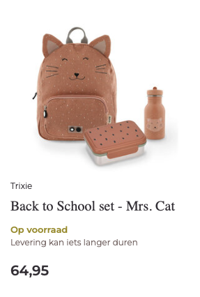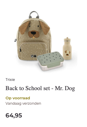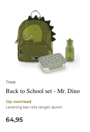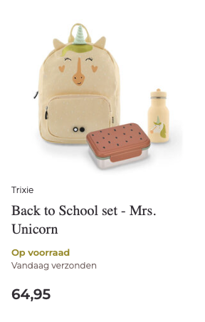 Die eerste schooldag wordt natuurlijk éxtra leuk met allemaal nieuwe spulletjes. Met onze schoolsetjes ben je in één keer klaar. Wil je kindje liever los een rugtasje, drinkbeker en lunchtrommeltje uitzoeken, dan kan dat natuurlijk ook! Bekijk alle schoolspulletjes in de Back to School categorie.